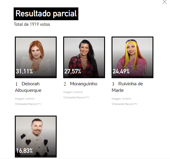 Com isso a roça ficou formada entre Alex, Deborah, Moranguinho e Ruivinha. A Record avisou que essa semana, os 2 MENOS votados estão eliminados.