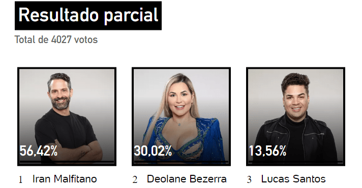 Com isso a roça ficou formada entre Deolane, Iran Malfitano e Lucas. O portal do UOL fez uma enquete que mostra quem vai sair nesta quinta-feira, ao vivo. Confira!