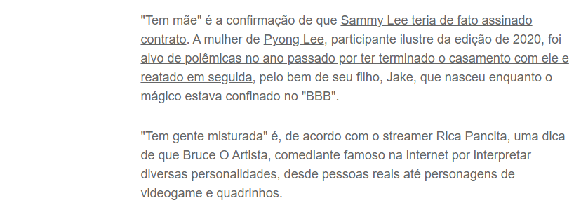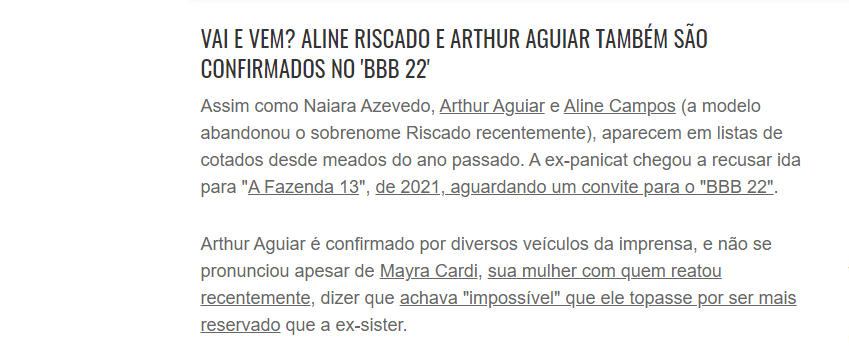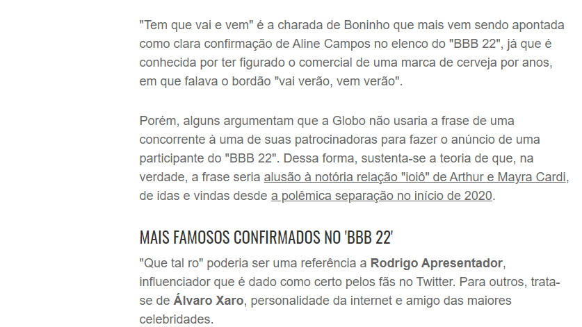 Enquanto isso, muitos acreditam que pode ser a confirmação de MC Loma, que deu indícios de sua participação no “BBB 22” na web, ou de Negra Li, aparecendo nas listas de cotados desde o início. Já outros indicam o nome de Naiara Azevedo em outra pista.