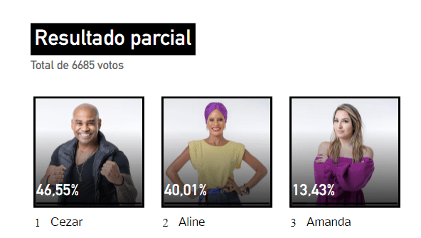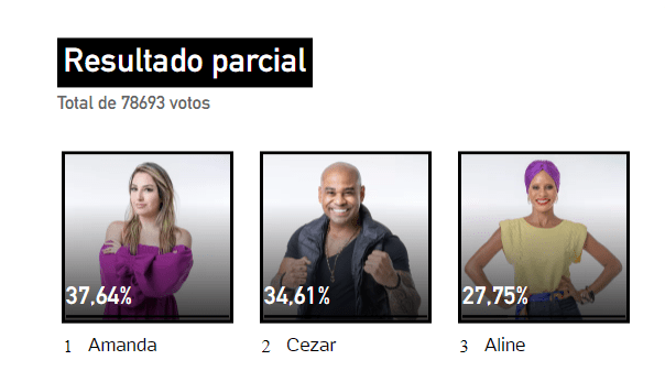 Cezar e Aline foram os mais votados da casa e com isso ele se juntaram a Amanda nesta paredão, que não teve bate e volta. O site da UOL fez uma enquete em que mostra quem vai sair na quinta-feira, ao vivo:
