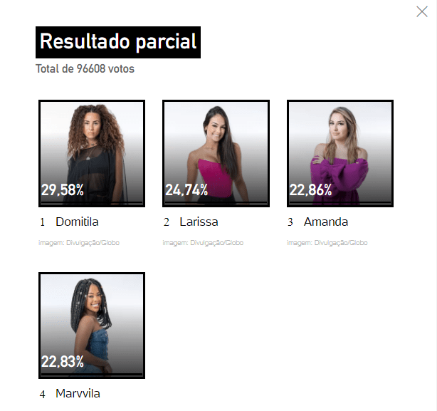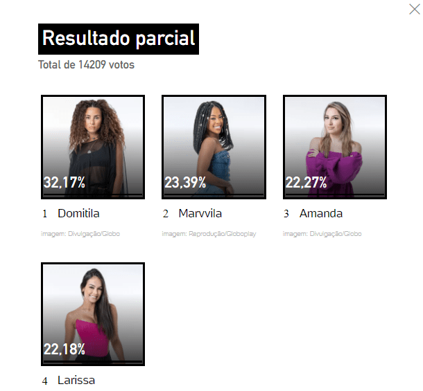 O paredão da semana ficou assim: Amanda, Domitila, Larissa e Marvvila. A enquete UOL teve uma grande reviravolta desde domingo, veja abaixo: