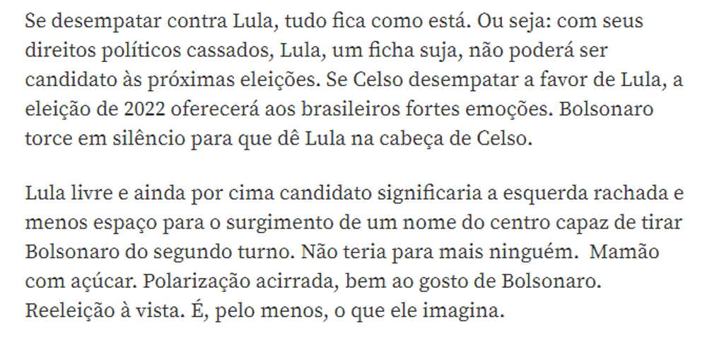 De acordo com o portal de notícias online da revista ‘Veja’, para Bolsonaro ter Lula como adversário direto nas próximas eleições presidenciais seria uma ótima jogada e com a quase certeza de vitória.