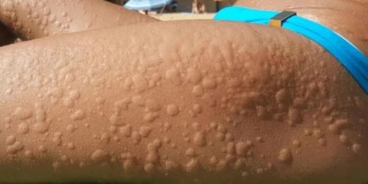 • Manchas vermelhas em alto relevo, conhecidas como urticária
