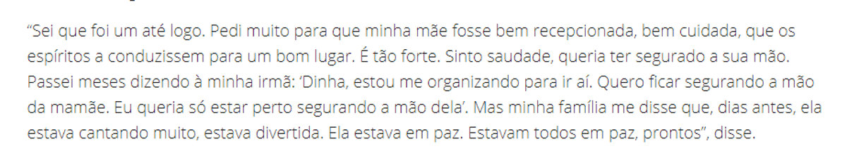Ela partiu no fim de agosto, em plena pandemia. Não morreu de Covid, mas foi colocada dentro de um saco como todos; foi-se sem eu vê-la, sem eu me despedir. Enfiaram o corpo dentro de um caixão e não conseguimos nem colocar uma roupa, não a vimos no pós-morte”, revelou Cássia em entrevista à coluna de Patrícia Kogut.