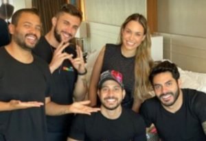 Arthur, Caio, Projota, Rodolffo e Sarah apareceram juntos em uma foto retirada no quarto de hotel, no dia do reencontro.