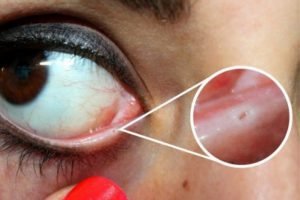 Se você nunca viu esse furinho, basta ficar frente a um espelho e puxar levemente a pálpebra para que o furinho seja visto, como mostra a imagem abaixo.